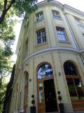 Široko ugaono pročelje sa erkerom i tornjićem čini ovu zgradu veoma prepoznatljivom.