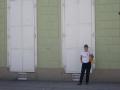 Interesantna fasada mirnih pastelnih tonova i dekorisanog sprata suprotstavljenog potpuno ravnom prizemlju, dok je odnos u centru obrnut - terasa jednostavne ograde na spratu prema bogato rezbarenim krilima kapije na ulazu.