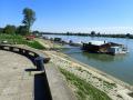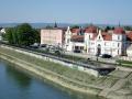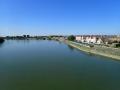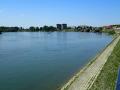 Prostrano uređeno šetalište, lep niz kuća i široka reka. Prijatne boje po sunčanom danu.