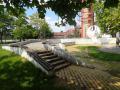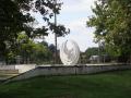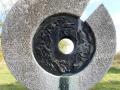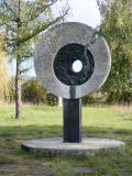 Plato sa skulpturom je vizuelno oivičen uzdignutom stazom i klupama za sedenje.