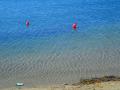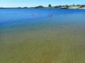 Vrlo bistru vodu okružuje široka peščana plaža sa špalirom suncobrana od trske.