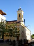 Barokna crkva, fasada dvobojno krečena, pokošena porta sa nekoliko stabala i klupama za odmor.
